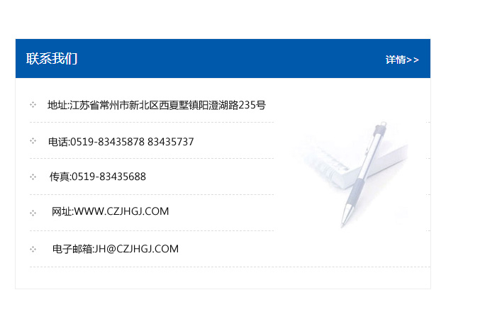 地址:常州市新北區友邦商務大廈1幢16、17層  電話:0519-85101652  傳真:0519-85112595  郵編:213022  網址:www.cz-jiayue_cn.gzrtjd.com  郵箱:xiajifengaa@163.com